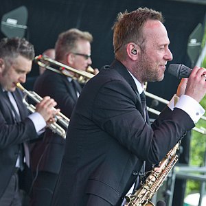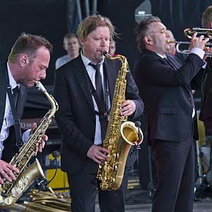 Po godzinie 18 na scenie w pełnym składzie pojawili się Poparzeni Kawą Trzy. Potężna sekcja dęta, humorystyczne teksty i energetyczna muzyka, to cechy wyróżniające ten zespół. W zespole mogliśmy zobaczyć Wojciecha Jagielskiego grającego na perkusji oraz Jacka Kreta z puzonem. Za teksty zespołu odpowiada Rafał Bryndal.