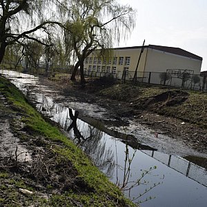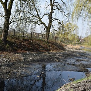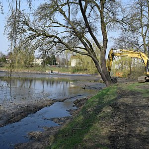 Od mniej więcej wczoraj prace w naszym dziewiętnastowiecznym ogrodzie dworskim koncentrują się na stawie. Najbardziej zaniepokojone wydają się być bytujące tu na co dzień kaczki, choć zdzwionych min nie brak też na twarzach przystających tu dość tłumnie przechodniów. Firma Ziel-Bud, realizująca renowację, wybiera właśnie dno ze stawku, bo wodę już wybrała, choć o osuszeniu zbiornika mowy tu być nie może, gdyż woda wąską strugą wpływa tu na bieżąco z bliżej niekreślonych rejonów okołokolejowych (może ktoś wie, skąd dokładnie?), po czym, również w bliżej nieokreślonym kierunku wypływa.