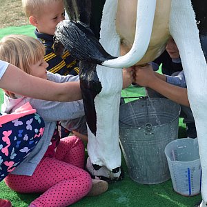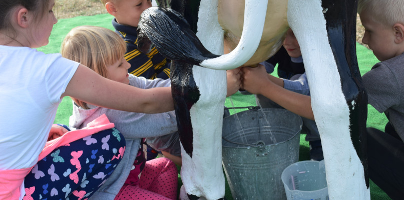 Szczególne powodzenie miała dożynkowa krowa, która wyjątkowo spokojnie dawała się doić chmarom dzieci.