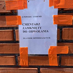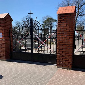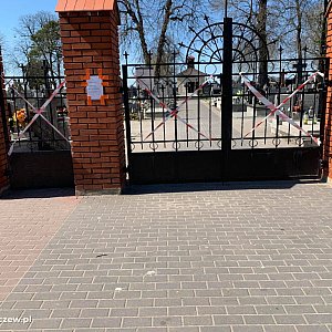 Komunikat dotyczący możliwości odwiedzin na cmentarzu parafii św. Wawrzyńca jest wystarczająco czytelny. Oklejona taśmami ostrzegawczymi brama, zamknięte na klucz furtki i dodatkowo kartka: „Z powodu epidemii cmentarz zamknięty do odwołania dla osób odwiedzających”.