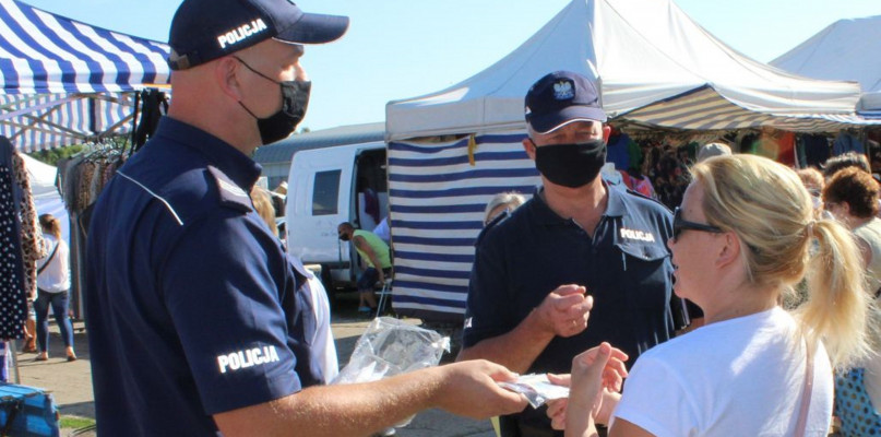 Od 20 sierpnia w powiecie łowickim obowiązują nowe ograniczenia sanitarne. Policjanci sprawdzają czy społeczeństwo się do nich stosuje oraz rozdają maseczki, przypominając o obowiązku zasłaniania ust i nosa.