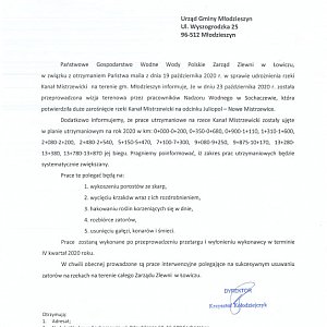 W związku z czynnościami podjętymi przez gminę Młodzieszyn oraz interwencją Gminnego Zakładu Gospodarki Komunalnej w Młodzieszynie, w sprawie udrożnienia rzeki Kanał Mistrzewicki na odcinku Juliopol - Nowe Mistrzewice, udało się uzyskać przychylność Państwowego Gospodarstwa Wodnego Wody Polskie w przedmiotowym zakresie.