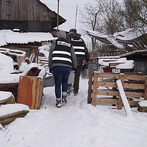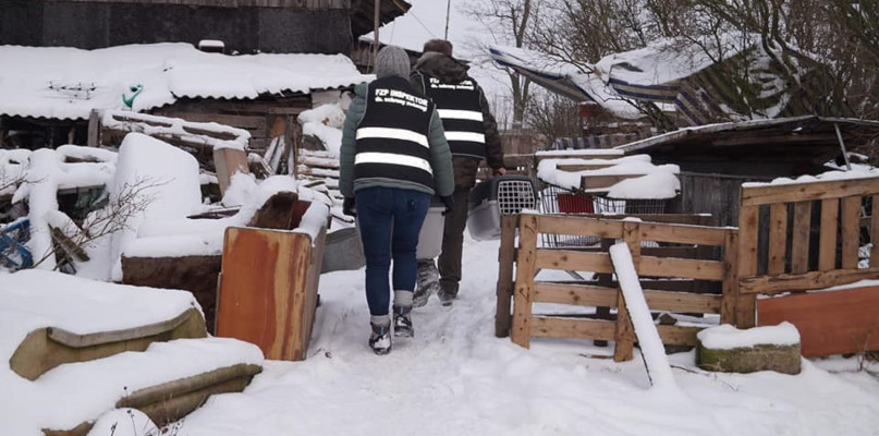 - Kolejna interwencja. Bida aż piszczy, ale na posesji mnóstwo zwierząt kaczki, gęsie, króliki i aż 5 psiaków, w tym malunia sunia ze szczeniaczkiem. Warunki skandaliczne - rozpadające się namiastki bud, wiatr gwiżdże w każdej szparze, zamarzłe miski z jakąś breją. Oczywiście psy na łańcuchach, wrośniętych w szyje, bez obróżek. Kaczki i gęsie przebierają łapkami na lodzie, króliki w klitkach, bez ścian, z otwartym dachem. Inspektor poucza właścicielkę o konieczności poprawienia warunków bytowych i , o dziwo, kobieta bez szemrania podpisują zrzeczenie. Pakujemy psiaki do kontenerów i ruszamy do lecznicy – podsumowuje Marta Włodarczyk.