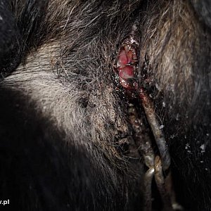 - Pierwsza posesja wcale nie sprawiała wrażenia biedy, ocieplony budynek, pomieszczenia gospodarcze, a koło domu jeden pies w dużej blaszanej beczce. Podścielona przez łaskawcę gołą deska. Miała chyba ocieplać od dołu. Pies na krótkim łańcuchu, wrośniętym w szyję. Obok buda nieocieplona, bez słomy, a przy niej na króciutkim łańcuchu mała sunieczka z krzywo zrośniętą łapką. Dobrze ubrany pan nie czuje zimna i chyba uważa, że brak obroży jest w porządku. Najwyraźniej myśli, że jest dobrym człowiekiem. W asyście policji odbieramy psy i wędrują do Zielonego Psa.