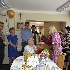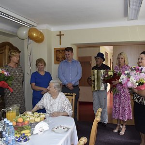 Ubiegły czwartek przejdzie do historii w Domu Pomocy Społecznej w Młodzieszynie. Tego dnia uroczyście obchodzono 100. Urodziny jednej z pensjonariuszek pani Marianny. Na wyjątkowe urodziny przybył wnuczek sędziwej seniorki. Jubilatce w imieniu personelu i mieszkańców życzenia złożył dyrektor DPS Konrad Jakubowski i obdarował seniorkę pięknym bukietem kwiatów. O seniorce pamiętała również starosta Jolanta Gonta, która przekazała kwiaty i list gratulacyjny.