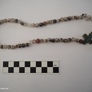 - Jeżeli chodzi o przedmioty z grobów, te nie były bogato wyposażone. Z takich nowożytnych ciekawszym był rodzaj ryngrafu z zachowaną dziś już nieczytelną niestety blaszką i dosyć dobrze zachowaną tkaniną. Z grobów średniowiecznych wydobyliśmy dwa różańce ze szklanych paciorków, w tym jeden zachowany praktycznie w całości, oczywiście bez nici, ale z krzyżykiem.