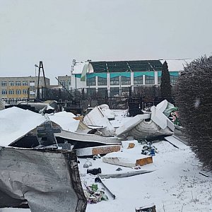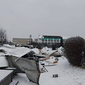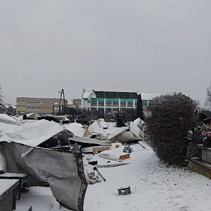 - Dach na hali mierzy powyżej 1000 metrów, z czego około 1/3 została zerwana przez wiatr. Elementy tego dachu znalazły się na pobliskim boisku szkolnym, jak i sąsiednim cmentarzu.