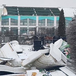 Ludzie wy się martwicie o pomniki !!! Cieszmy się ze nikt tamtędy akurat nie szedł , ze dziecia będące na hali nic się nie stało . Mogła stać się ogromna tragedia - wystarczyłoby gdyby wiatr zawiał w inna stronę i cały dach poleciał w stronę Kauflandu gdzie ludzie akurat wychodzili z auta lub na stacje benzynowa .