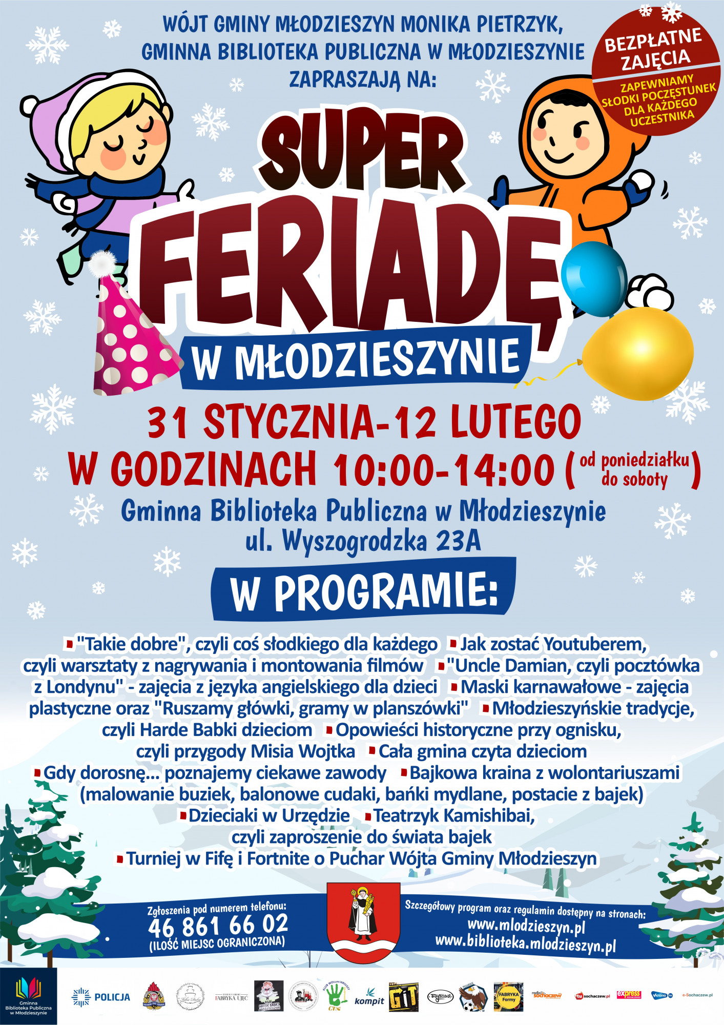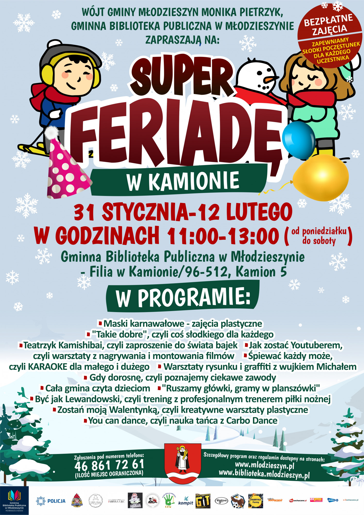 Każdy z uczestników dzięki wsparciu Urzędu Gminy Młodzieszyn ma zapewniony słodki poczęstunek. Wszystkie zajęcia podczas "SUPER FERIADY" są dla uczestników całkowicie bezpłatne. Zapisy przyjmowane są telefonicznie (w godzinach pracy instytucji): Gminna Biblioteka Publiczna w Młodzieszynie tel. 46 861 66 02 Filia Biblioteczna w Kamionie tel. 46 861 72 61
