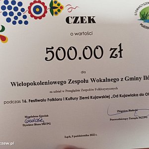 No sukces niebywały ,na czeku wyrażnie jest ,, za udział w Festiwalu Folkloru i Kultury Ziemi Kujawskiej i Mazowieckiej „Od Kujawiaka do Oberka” także osiągnięcie to tak jakbym z chłopakami poskakał trochę i tez bym za udział dostał.ALE nie mówcie sukces JP3-GO jest ,Wójt może być dumny.
