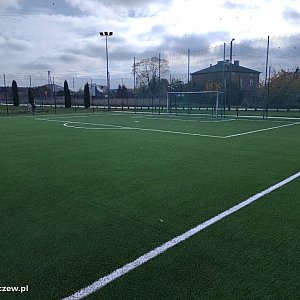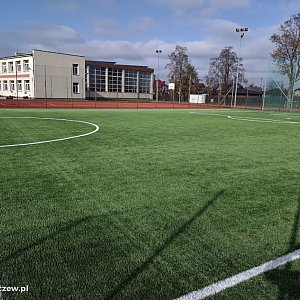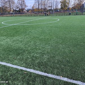 Wymianie nawierzchni ze sztucznej trawy na boisku do piłki nożnej.