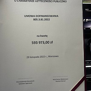 W dniu 29 listopada 2022r. w Mazowieckim Urzędzie Wojewódzkim w Warszawie podpisano umowę na pozyskane przez Gminę Młodzieszyn dofinansowanie na przewozy autobusowe w ramach Funduszu rozwoju przewozów autobusowych o charakterze użyteczności publicznej w kwocie 593.973,00 zł, na dziewięć linii autobusowych.