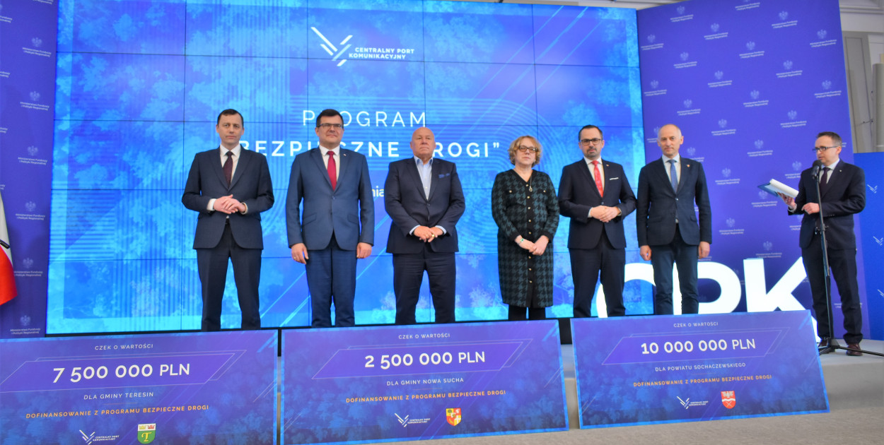 W środę 12 kwietnia w Ministerstwie Funduszy i Polityki Regionalnej w Warszawie Spółka Centralny Port Komunikacyjny ogłosiła wyniki programu „Bezpieczne Drogi”. Budżet programu wynosi blisko 80 mln zł z czego 20 mln zł trafi do powiatu sochaczewskiego. Inicjatywa „Bezpieczne Drogi” przeznaczona jest na dofinansowanie zadań planistycznych, projektowych i realizacyjnych jednostek samorządu terytorialnego w otoczeniu projektowanego Centralnego Portu Komunikacyjnego. Chodzi o obszar czterech powiatów i dziewięciu gmin. Programem objęty jest powiat grodziski z gminami: Baranów, Jaktorów oraz z gminą i miastem Grodzisk Mazowiecki; powiat sochaczewski z gminami: Nowa Sucha i Teresin; powiat warszawski zachodni z gminą i miastem Błonie, a także powiat żyrardowski z gminą Radziejowice, gminą i miastem Wiskitki oraz miastem Żyrardów.