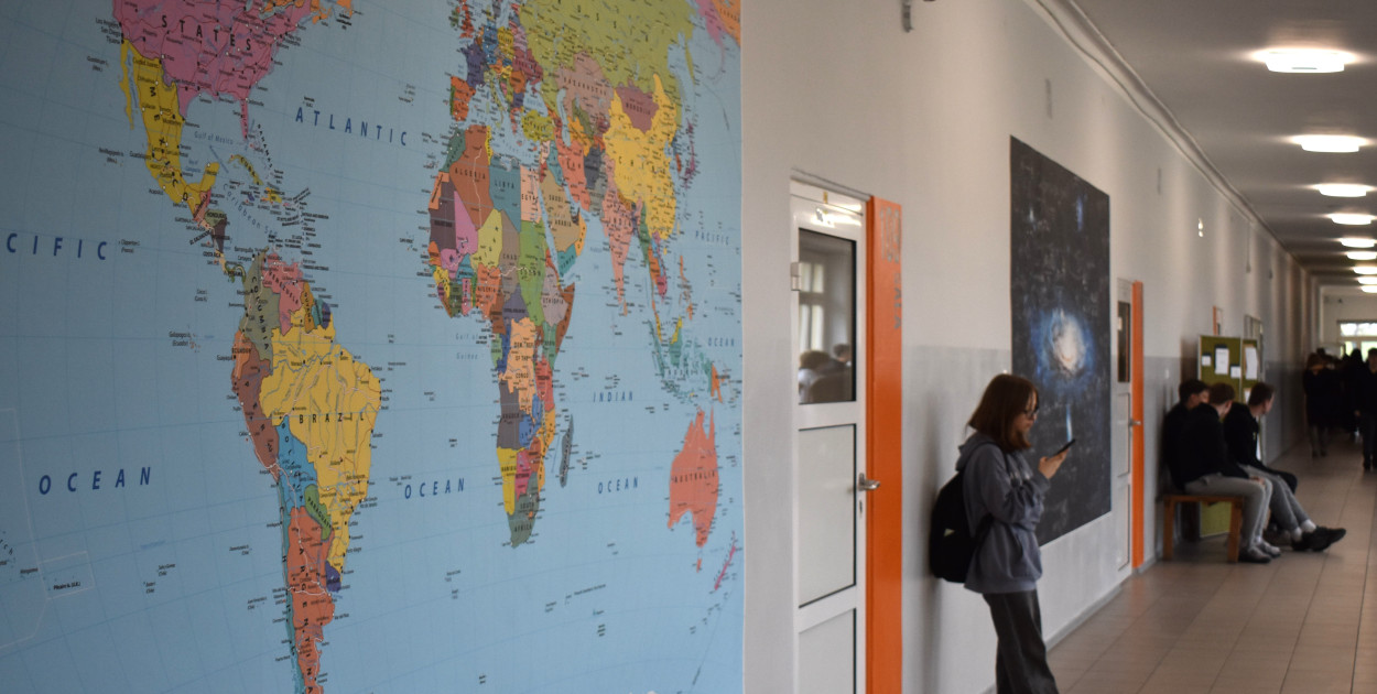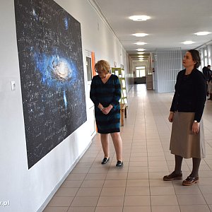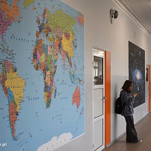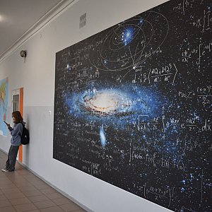 Dyrektor ZS RCKU w Sochaczewie zaprosił dziś gości, by zaprezentować nowe oblicze placówki. Wszystko za sprawą niesztampowego odnowienia korytarzy. Na ścianie pojawiły się dwie duże grafiki: mapa polityczna świata oraz Galaktyka Andromedy na tle wzorów fizycznych i astronomicznych.