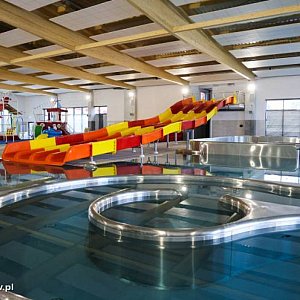 - Najbardziej ekstremalną jest tzw. aqualoop, który zaczyna się od pionowego startu i prawie pionowego ślizgu przez trzy piętra. Kilkusekundowy zjazd z prędkością dochodzącą do 50 km/h dostarcza silnych emocji. Najdłuższa liczy 140 metrów długości. Nazywa się multimedialną, bo całą trasę pokonamy w towarzystwie efektów dźwiękowych i świetlnych. Szybsza od niej, bo bardziej stroma, jest zjeżdżalnia rurowa o długości 90 m. Jest też trzydziestometrowa zjeżdżalnia „rainbow” o czterech łagodnie pofalowanych torach. Zjedziemy nią wprost do niecki rekreacyjnej, gdzie czekają różne wodne atrakcje, m.in. rwąca rzeka, przeciwprąd, sztuczna fala, leżanki napowietrzające. Ma ona 600 mkw. powierzchni. Jest też basen sportowy o długości 25 m. A obok basen przygotowany specjalnie do nauki pływania, który w najgłębszym miejscu ma 150 cm. Dla dzieci urządzony został brodzik z dwiema zjeżdżalniami i innymi wodnymi zabawkami oraz plac wodny na zewnątrz obiektu. W głównej hali znajdziemy ponadto dwunastoosobowe jacuzzi. Z kolei dla wielbicieli relaksu i chcących skorzystać z zabiegów na ciało przygotowano strefę spa. Są w niej wanny z hydromasażem, grota solna, grota lodowa oraz sauny: sucha, parowa i infrared z chromoterapią