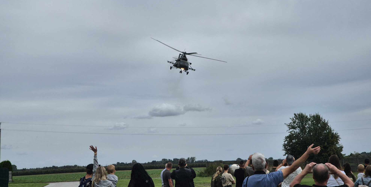 Dziewięciu spadochroniarzy z Ośrodka Szkolenia Spadochronowego szybowało w przestworzach z niezwykłą gracją, a potem równie lekko podeszło do lądowania. Szereg spadochroniarzy zamykał dowódca Ośrodka i spadochroniarz z biało-czerwoną flagą.