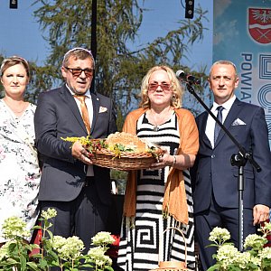 Po przemówieniach przyszedł czas na tradycyjny obrzęd dzielenia chlebem, przekazanym na ręce starosty Jolanty Gonty i wójta Jana Kraśniewskiego przez starostów tegorocznych dożynek Anetę i Andrzeja Roskosz.