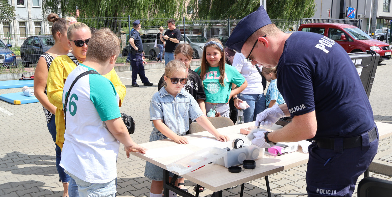 - W ramach naszego profilaktycznego namiotu można na przykład oznakować rower. Mamy też sporo atrakcji dla dzieci. To rysowanie kredą, kolorowanki z psim patrolem, gadżety, przede wszystkim odblaski, cieszące się ogromnym powodzeniem brokatowe tatuaże czy malowanie buziek. Obok widzimy stoisko naszego technika kryminalistyki, gdzie goście mogą zdejmować odciski linii papilarnych. Jak widzimy, to stoisko cieszy się również dużym powodzeniem, najwyraźniej kolega próbuje konkurować z naszymi tatuażami –