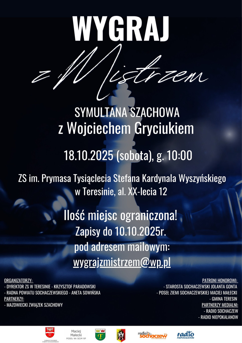 W Zespole Szkół w Teresinie odbędzie się wkrótce symultana szachowa z Wojciechem Gryciukiem. Hasło wydarzenia to „Wygraj z mistrzem”. Organizatorami są: radna powiatowa Aneta Sowińska oraz dyrektor Zespołu Szkół w Teresinie Krzysztof Paradowski.