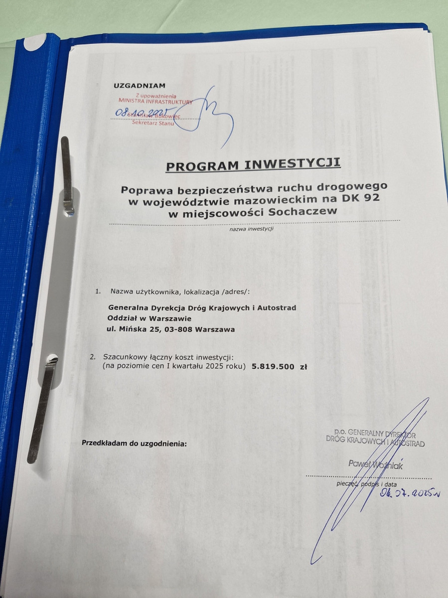 - Dzisiaj w Ministerstwie Infrastruktury został podpisany Program Inwestycji Drogowych na przyszły rok. I już wiemy, że będzie wielka inwestycja w Sochaczewie. Mamy to! Blisko 6 milionów złotych zostało zapisanych na poprawę bezpieczeństwa ruchu drogowego na DK 92 w Sochaczewie. Chodzi oczywiście o rondo przy Olimpijskiej. To ważna inwestycja dla naszych mieszkańców. Dziękuję Ministrowi Infrastruktury Dariuszowi Klimczakowi. Dziękuję Wiceministrowi Infrastruktury Stanisławowi Bukowcowi za współpracę. Dziękuję Burmistrzowi Miasta Sochaczew Danielowi Janiakowi za zaangażowanie –