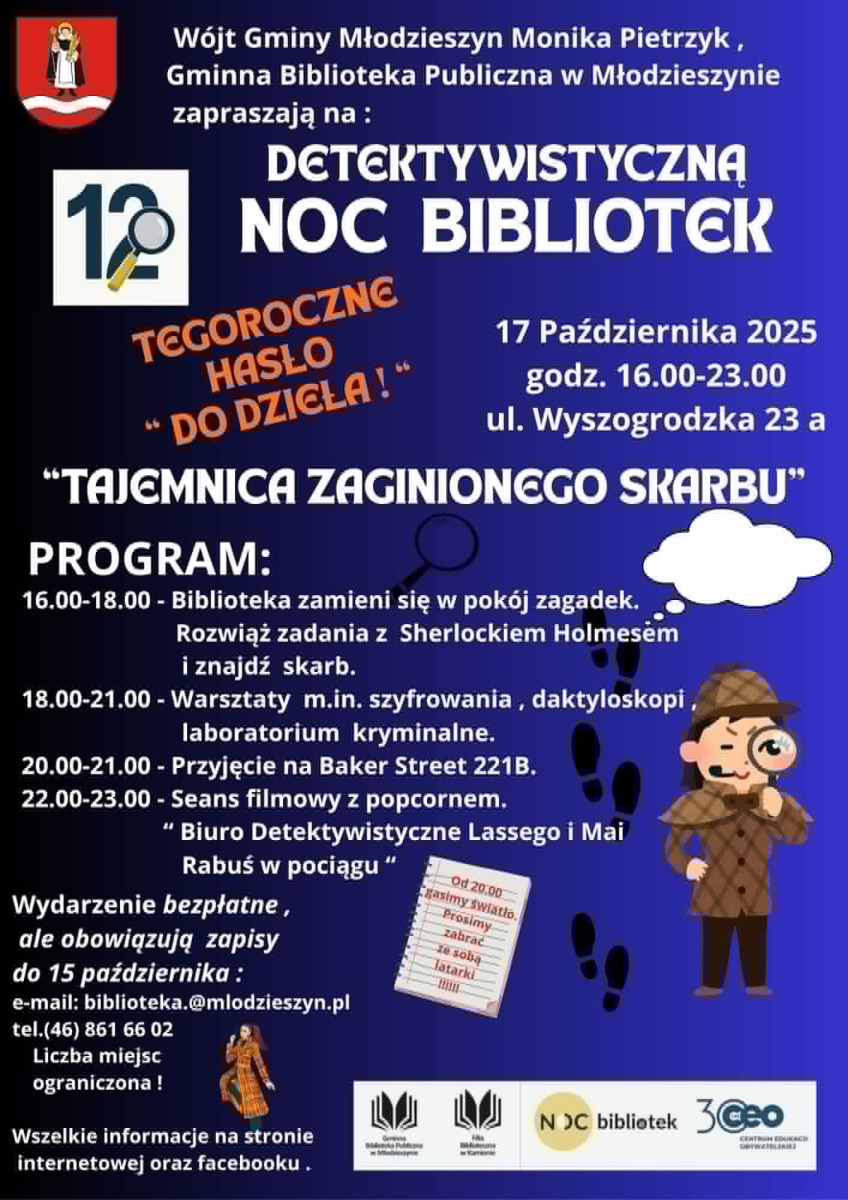 Gminna Biblioteka Publiczna w Młodzieszynie serdecznie zaprasza na 12. edycję ogólnopolskiej akcji "Noc Bibliotek", która w tym roku odbywa się pod hasłem „Do dzieła!”. To wyjątkowe święto bibliotek i czytania, które w niekonwencjonalny sposób zachęca do korzystania z zasobów bibliotek – miejsc otwartych, dostępnych dla wszystkich, pełnych inspiracji, spotkań i kultury.