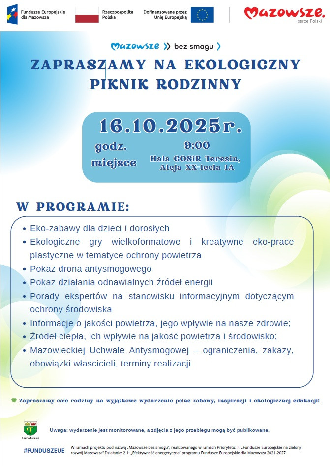 Całe rodziny mogą czuć się zaproszone na Ekologiczny Piknik Rodzinny, jaki odbędzie się 16 października o 9.00 w hali GOSiR-u w Teresinie. To wydarzenie realizowane w ramach projektu Mazowsze bez smogu. Zaplanowano szereg atrakcji.