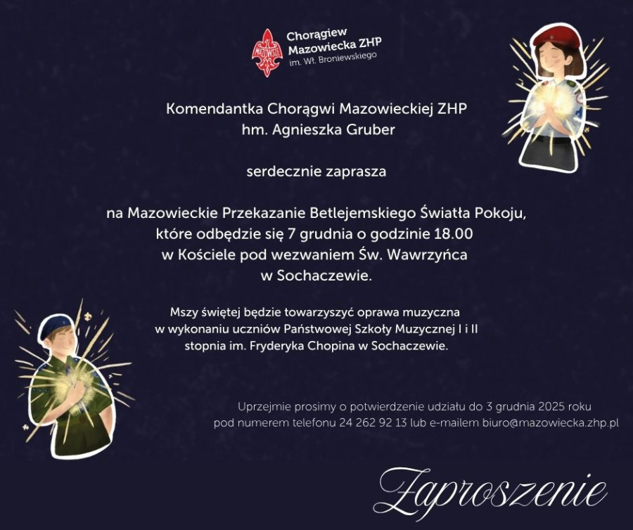 - Z radością zapraszamy na uroczystość przekazania Betlejemskiego Światła Pokoju, która odbędzie się 7 grudnia o godz. 18:00 w Kościele Parafii Św. Wawrzyńca w Sochaczewie (ul. Stefana Wyszyńskiego). Wydarzenie, w którym wezmą udział reprezentacje hufców z całego województwa, będzie miało wyjątkową oprawę muzyczną w wykonaniu uczniów Państwowej Szkoły Muzycznej I i II stopnia im. F. Chopina w Sochaczewie –