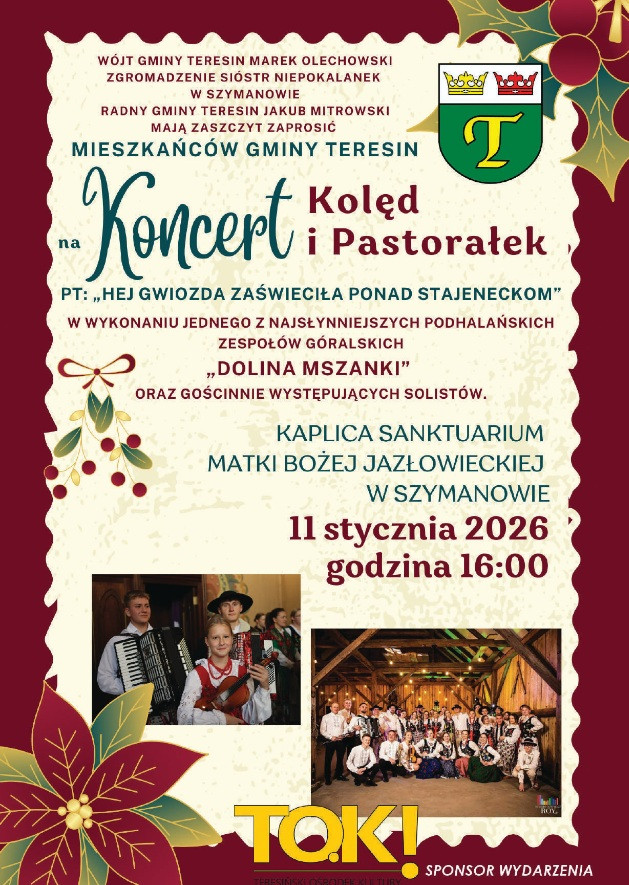 - Kolędować można do 2 lutego, dlatego serdecznie zapraszamy na koncert kolęd i pastorałek do Szymanowa. Przyjedzie tu jeden z najsłynniejszych podhalańskich zespołów góralskich Dolina Mszanki. Koncert odbędzie się 11 stycznia o godzinie 16.00 w Kaplicy Sanktuarium Matki Bożej Jazłowieckiej w Szymanowie –