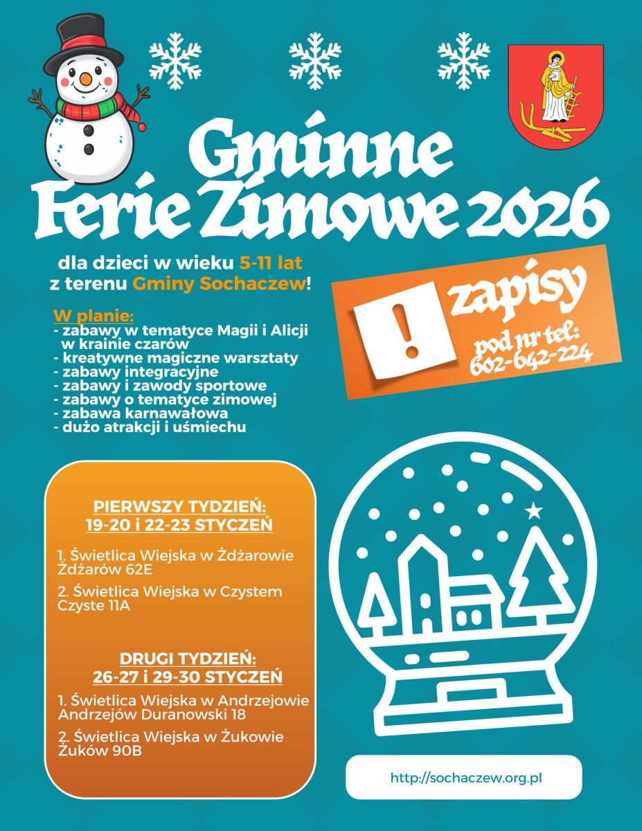 Wójt Gminy Sochaczew oraz Kierownik Świetlic Gminnych zapraszają dzieci w wieku 5-11 lat z terenu Gminy Sochaczew do udziału w Feriach Zimowych 2026 realizowanych w czterech świetlicach wiejskich!