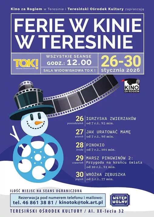 - Tradycyjnie zapraszamy na ferie z kinem w drugim tygodniu zimowej przerwy, a więc od 26 do 30 stycznia. Codziennie o godzinie 12.00 będziemy pokazywać filmy animowane i familijne. Będą Igrzyska Zwierzaków, piękny film dokumentalny o pingwinach - Marsz Pingwinów, film familijny Pinokio, Wróżka Zębuszka, a także bardzo wzruszający film animowany Jak uratować mamę –