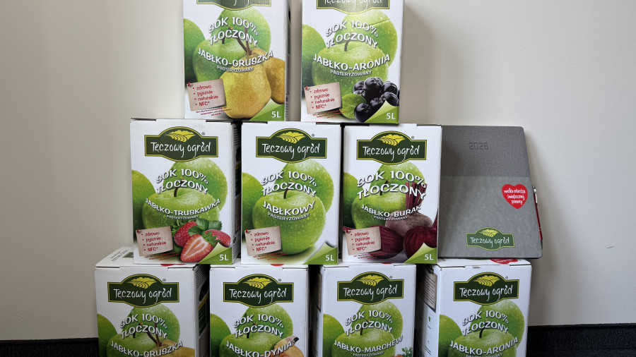 W tym roku aukcja obejmuje zestaw dziewięciu pięciolitrowych naturalnych soków (2x jabłko – gruszka, 2x jabłko – aronia, 1x jabłko – truskawka, 1x jabłko – burak, 1x jabłko – dynia, 1x jabłko – marchew, 1x jabłko), firmowy kalendarz i coś extra, choć z niewielkim odroczeniem – dzień w tłoczni zlokalizowanej w Brzozowcu w gminie Iłów w terminie ustalonym z darczyńcą (od września 2026 r.).