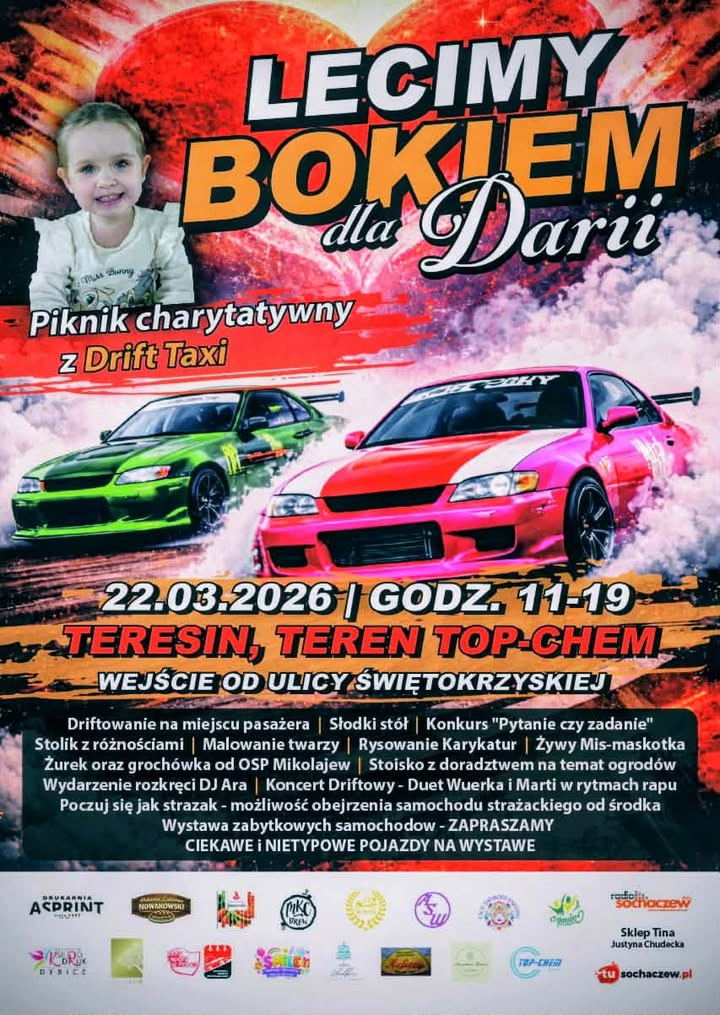 22 marca w Teresinie odbędzie się piknik charytatywny z Drift Taxi, zorganizowany z myślą o wsparciu leczenia Darii z Szymanowa, która cierpi na autyzm atypowy. Dziewczynka ma trzy latka. Nie mówi i ma problemy z komunikacją potrzeb. Mierzy się też z problemami jelitowymi. Cały czas jest diagnozowana i poddawana terapiom, a to generuje koszty. Zbyt duże do samodzielnego udźwignięcia przez jej rodzinę. Pomóc można poprzez udział w pikniku. Przygotowano moc atrakcji, z których największą będzie możliwość driftu z perspektywy fotela pasażera.
