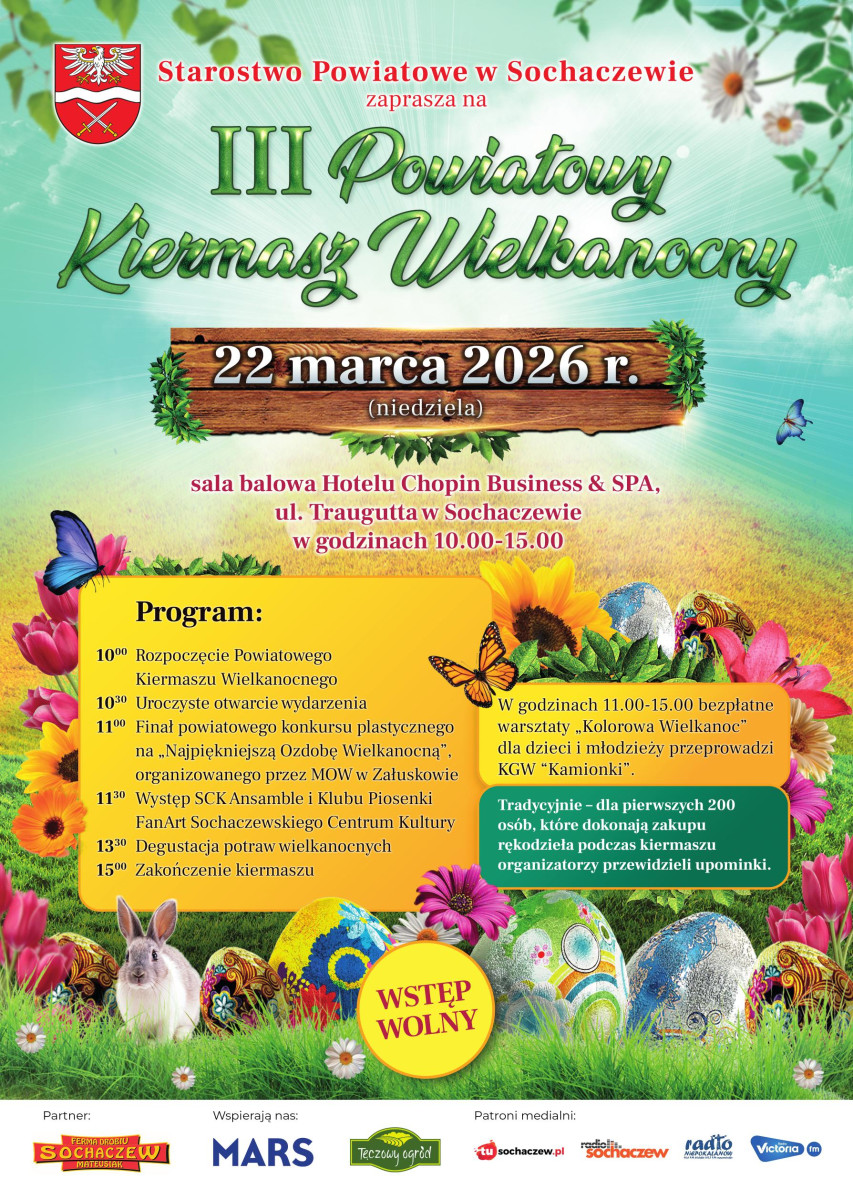 W najbliższą niedzielę 22 marca w Hotelu Chopin Business and Spa w Sochaczewie odbędzie się III Powiatowy Kiermasz Wielkanocny. Wydarzenie rozpocznie się o godzinie 10.00, ale oficjalne rozpoczęcie zaplanowano na 10.30.