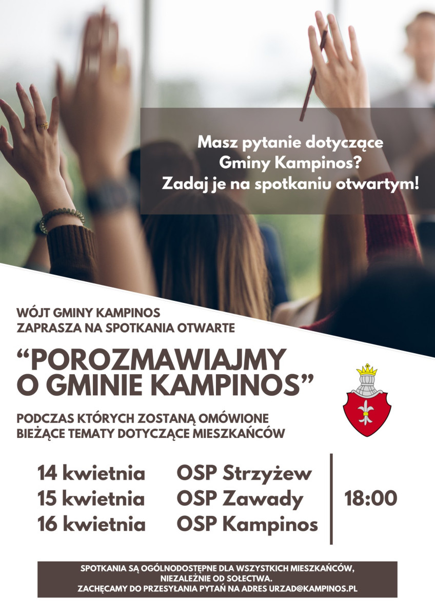 Spotkania są ogólnodostępne dla wszystkich mieszkańców, niezależnie od sołectwa. Urząd Gminy Kampinos zachęca również do przesyłania pytań drogą elektroniczną na email: [email protected] (w tytule wpisując SPOTKANIE OTWARTE).