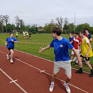 Jako pierwsze wystartowały szkoły podstawowe. Reprezentacje 10-osobowe, składające się z 5 chłopców i 5 dziewczyn, biegły przemiennie dystans 500 metrów. Od samego początku na prowadzenie wysunęła się sochaczewska Dwójka, w czym spora zasługa Oktawiana Gołębiowskiego.