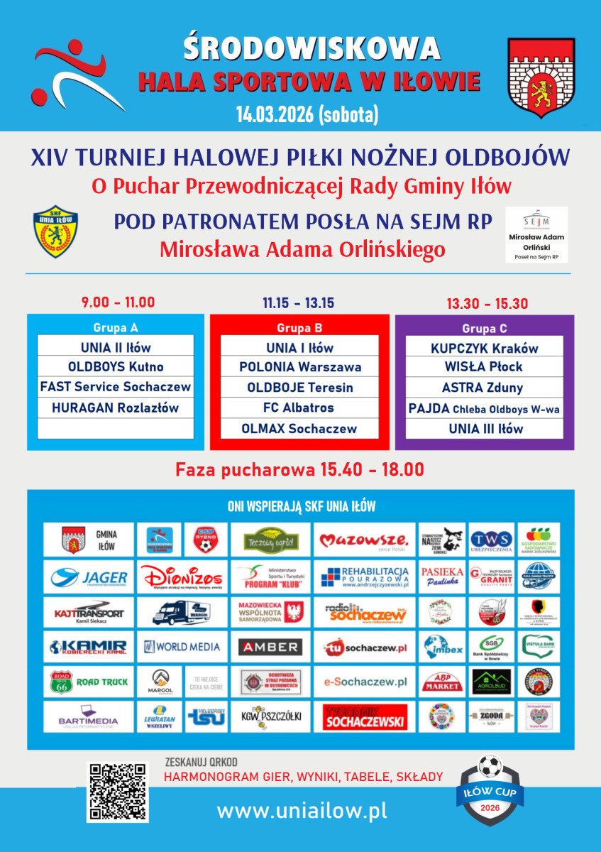 Zachęcamy miłośników piłki nożnej do kibicowania uczestnikom XIV Turnieju Halowej Piłki Nożnej Oldbojów o puchar Przewodniczącej Rady Gminy Iłów Renaty Bartosiak, pod patronatem posła na Sejm RP Adama Orlińskiego.