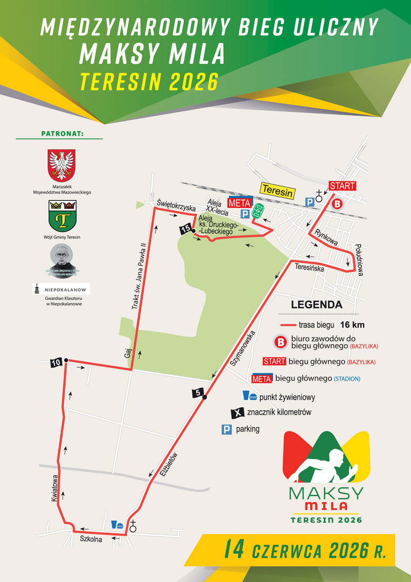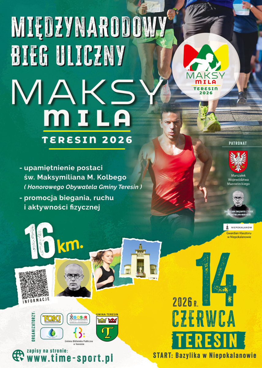Już 14 czerwca w Gminie Teresin odbędzie się bieg uliczny „MAKSY MILA 2026” na dystansie ok. 16 km. Bieg odbywa się pod patronatem Marszałka Województwa Mazowieckiego, Wójta Gminy Teresin, Przewodniczącego Związku Gmin Kolbiańskich oraz Gwardiana Klasztoru oo. Franciszkanów w Niepokalanowie.