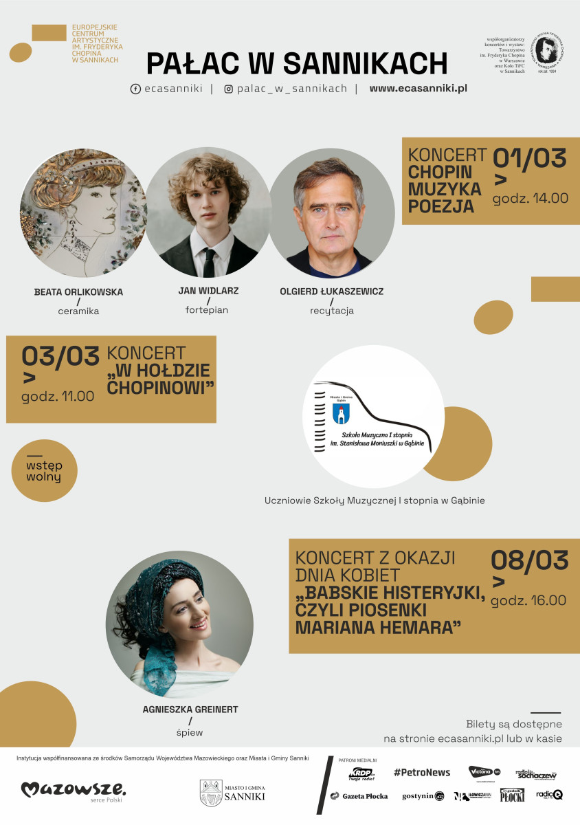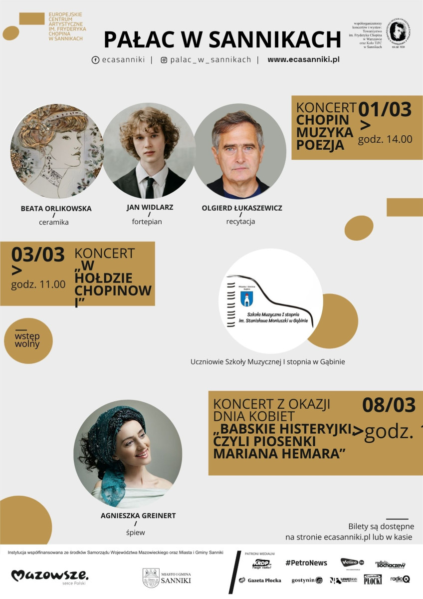 Europejskie Centrum Artystyczne im. Fryderyka Chopina w Sannikach zaprasza na Koncert „Chopin – Muzyka – Poezja”. To wyjątkowe wydarzenie odbędzie się w niedzielę, 1 marca 2026 r. o godz. 14.00 w sali koncertowej sannickiego pałacu.
