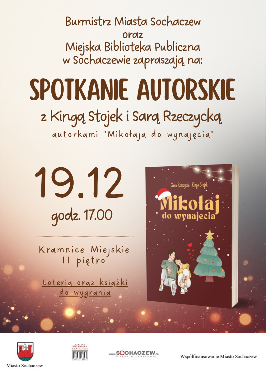 Sochaczewski ratusz zaprasza do miejskich kramnic na spotkanie autorskie z Kingą Stojek i Sarą Rzeczycką. To autorki książki pod tytułem 'Mikołaj do wynajęcia”. Obie pisarki specjalizują się w literaturze obyczajowej i romansach, a jedna z nich, Sara Rzeczycka, pochodzi z Sochaczewa. Podczas spotkania autorki opowiedzą o kulisach powstania książki, a także o pracy w duecie pisarskim. Zapraszamy 19 grudnia o godzinie 17.00.