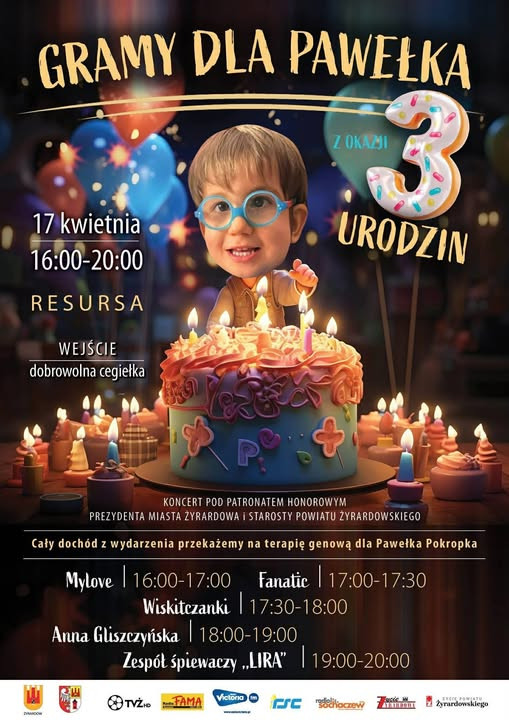 Zapraszamy do udziału w wydarzeniu charytatywnym „Gramy dla Pawełka z okazji 3. urodzin”, jakie odbędzie się w Żyrardowie. Na scenie pojawią się wokaliści i zespoły, a wszystko to z myślą o chłopcu, którego terapię wyceniono na 16 mln zł.