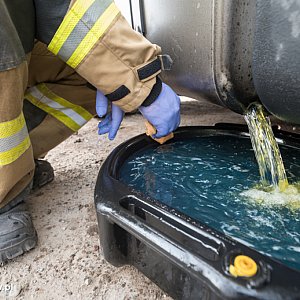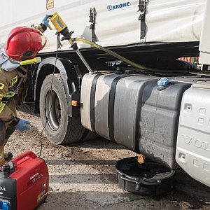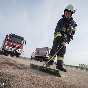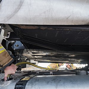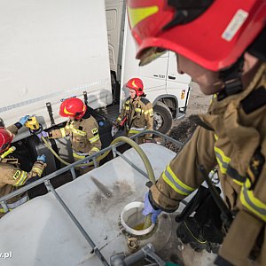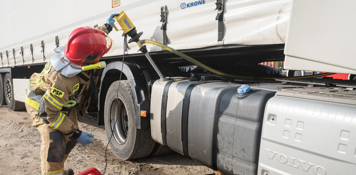 Działania strażaków polegały na sorpcji rozlanego na jezdni oleju napędowego oraz przepompowaniu medium do drugiego zbiornika ciężarówki oraz dowiezionego samochodem operacyjnym zbiornika DPPL.