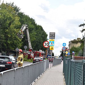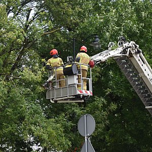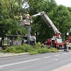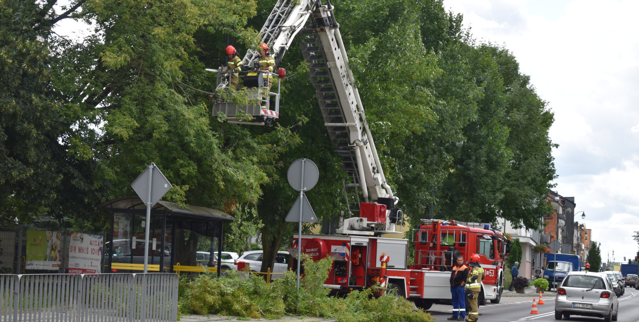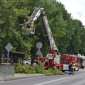 We wtorek przed południem sochaczewscy strażacy złapali za piły i z podnośnika rozpoczęli prace, mające na celu usunięcie konaru drzewa, które zostało naruszone prawdopodobnie w czasie ostatnich wichur i zagrażało tym samym przechodniom. Gałęzie niebezpiecznie wisiały nad przystankiem autobusowym i pobliskim placem zabaw.
