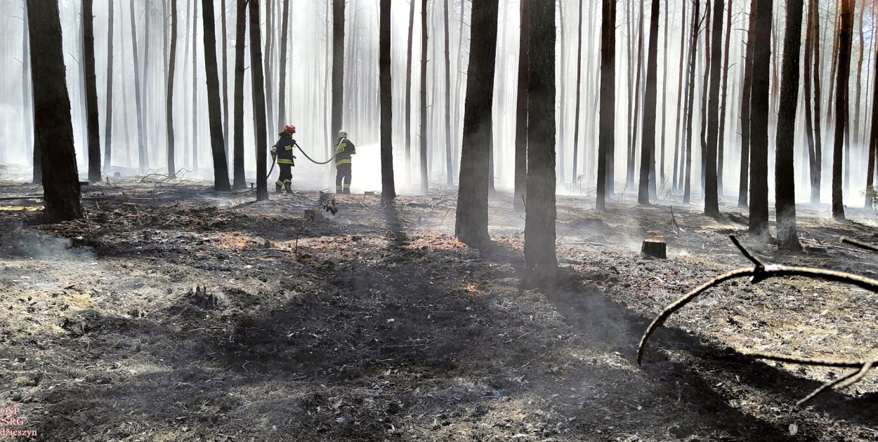 - Prowadzone działania polegały na podaniu czterech prądów wody w natarciu na palącą się ściółkę leśną, zasileniu wodnym jednostek prowadzących akcję gaśniczą, dogaszaniu pogorzeliska, wyoraniu bruzdy wokół pogorzeliska przy użyciu ciągnika –