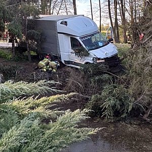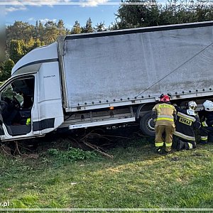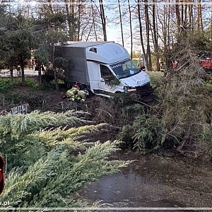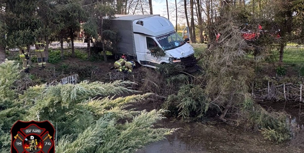 Kierujący pojazdem marki Volkswagen Crafter zjechał z jezdni, następnie uderzył w drzewo i zatrzymał się nad zbiornikiem wodny.