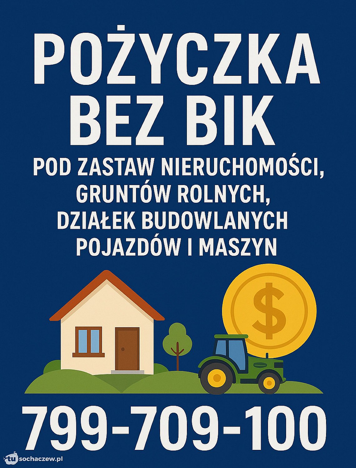 bez BIK! Udzielamy pożyczek pod zastaw: - nieruchomości - gruntów rolnych - działek budowlanych - pojazdów i maszyn Szybka decyzja, minimum formalności. Atrakcyjne oprocentowanie Nie sprawdzamy BIK! Zadzwoń